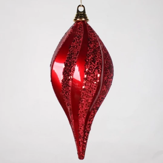 12 inch Christmas Candy Glitter Swirl Drop Ornament: Red. Getting the look of a professionally decorated tree at home is easy when you start with eye-catching glittered ornaments such as this swirl design. The shiny candy finish is beautifully offset with alternating swirls of twinkling glitter. This ornament was made to coordinate seamlessly with the others in the candy glitter line so feel free to mix and match them based on your color scheme.