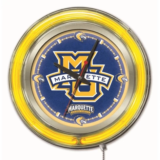 Our neon-accented Logo Clocks are the perfect way to show your school pride. Chrome casing and a team specific neon ring accent a custom printed clock face, lit up by an brilliant white, inner neon ring. Neon ring is easily turned on and off with a pull chain on the bottom of the clock, saving you the hassle of plugging it in and unplugging it. Accurate quartz movement is powered by a single, AA battery (not included). Whether purchasing as a gift for a recent grad, sports super fan, or for yourself, you can take satisfaction knowing you’re buying a clock that is proudly made by the Holland Bar Stool Company, Holland, MI.