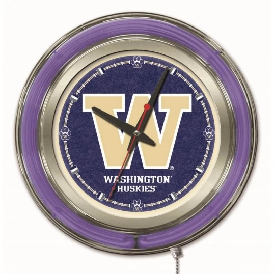 Our neon-accented Logo Clocks are the perfect way to show your school pride. Chrome casing and a team specific neon ring accent a custom printed clock face, lit up by an brilliant white, inner neon ring. Neon ring is easily turned on and off with a pull chain on the bottom of the clock, saving you the hassle of plugging it in and unplugging it. Accurate quartz movement is powered by a single, AA battery (not included). Whether purchasing as a gift for a recent grad, sports super fan, or for yourself, you can take satisfaction knowing you’re buying a clock that is proudly made by the Holland Bar Stool Company, Holland, MI.