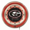 Our neon-accented Logo Clocks are the perfect way to show your school pride. Chrome casing and a team specific neon ring accent a custom printed clock face, lit up by an brilliant white, inner neon ring. Neon ring is easily turned on and off with a pull chain on the bottom of the clock, saving you the hassle of plugging it in and unplugging it. Accurate quartz movement is powered by a single, AA battery (not included). Whether purchasing as a gift for a recent grad, sports super fan, or for yourself, you can take satisfaction knowing you’re buying a clock that is proudly made by the Holland Bar Stool Company, Holland, MI.