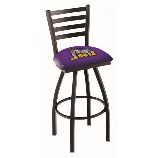 Made for the ultimate sports fan, impress your buddies with this knockout from Holland Bar Stool. This contemporary 25 inch Black James Madison Swivel Bar Stool has a defined ladder style back that doesnt just add comfort, but sophistication. Holland Bar Stool uses a detailed screen print process that applies specially formulated epoxy-vinyl ink in numerous stages to produce a sharp, crisp, clear image of your desired logo. You can not find a higher quality logo stool on the market. The plating grade steel used to build the frame is commercial quality, so it will withstand the abuse of the rowdiest of friends for years to come. The structure is powder-coated black wrinkle to ensure a rich, sleek, long lasting finish. Construction of this framework is built tough, utilizing solid welds. If you are going to finish your bar or game room, do it right with a Holland Bar Stool.