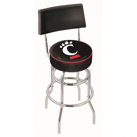 Made for the ultimate sports fan, impress your buddies with this knockout from Holland Bar Stool. This contemporary 25 inch Chrome 2-Ring Cincinnati Swivel Bar Stool with Back has a 4 inch cushion with a tough double-ring base with a chrome finish and a cushioned back to achieve maximum comfort and support. Holland Bar Stool uses a detailed screen print process that applies specially formulated epoxy-vinyl ink in numerous stages to produce a sharp, crisp, clear image of your teams emblem. You can not find a higher quality logo stool on the market. The structure is triple chrome-plated to ensure a rich, polished finish that will last ages.