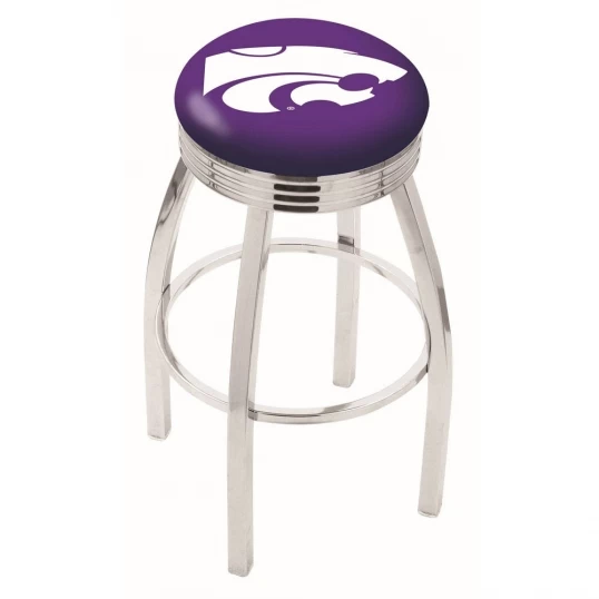 Made for the ultimate sports fan, impress your buddies with this knockout from Holland Bar Stool. This contemporary 25 inch Chrome Kansas State Swivel Bar Stool with Ribbed Accent has a single-ring chrome base with a 2.5 inch cushion and a 3 inch chrome ribbed accent ring that helps the seat to pop-out at first glance. Holland Bar Stool uses a detailed screen print process that applies specially formulated epoxy-vinyl ink in numerous stages to produce a sharp, crisp, clear image of your teams emblem. You can not find a higher quality logo stool on the market. The plating grade steel used to build the frame is commercial quality, so it will withstand the abuse of the rowdiest of friends for years to come. The structure is triple chromed to ensure a rich, sleek, long lasting finish. Construction of this framework is built tough, utilizing solid mig welds. If you are going to finish your bar or game room, do it right with a Holland Bar Stool.