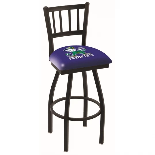 Made for the ultimate sports fan, impress your buddies with this knockout from Holland Bar Stool. This contemporary 30 inch Black Notre Dame Leprechaun Jailhouse Back Swivel Counter Stool has a defined Jailhouse back that doesnt just add comfort, but sophistication. Holland Bar Stool uses a detailed screen print process that applies specially formulated epoxy-vinyl ink in numerous stages to produce a sharp, crisp, clear image of your desired logo. You can not find a higher quality logo stool on the market. The plating grade steel used to build the frame is commercial quality, so it will withstand the abuse of the rowdiest of friends for years to come. The structure is powder-coated black wrinkle to ensure a rich, sleek, long lasting finish. Construction of this framework is built tough, utilizing solid welds. If you are going to finish your bar or game room, do it right with a Holland Bar Stool.