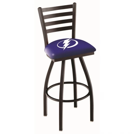 Made for the ultimate sports fan, impress your buddies with this knockout from Holland Bar Stool. This contemporary 30 inch Black Tampa Bay Lightning Ladder Back Swivel Counter Stool defined ladder style back that doesnt just add comfort, but sophistication. Holland Bar Stool uses a detailed screen print process that applies specially formulated epoxy-vinyl ink in numerous stages to produce a sharp, crisp, clear image of your desired logo. You can not find a higher quality logo stool on the market. The plating grade steel used to build the frame is commercial quality, so it will withstand the abuse of the rowdiest of friends for years to come. The structure is powder-coated black wrinkle to ensure a rich, sleek, long lasting finish. Construction of this framework is built tough, utilizing solid welds. If you are going to finish your bar or game room, do it right with a Holland Bar Stool.