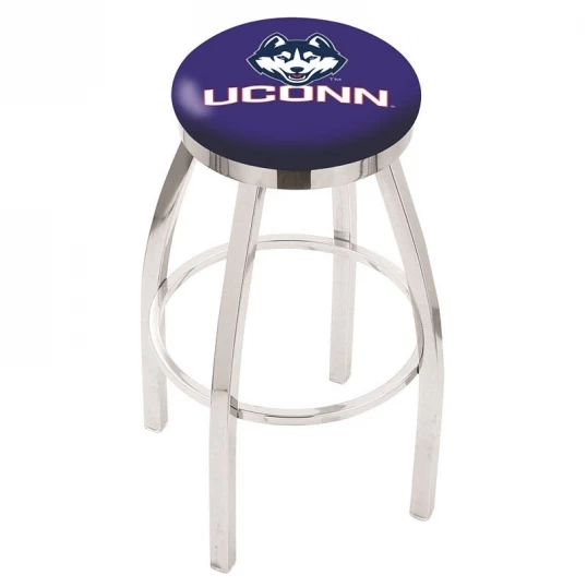 Made for the ultimate sports fan, impress your buddies with this knockout from Holland Bar Stool. This contemporary 30 inch Chrome Connecticut Swivel Counter Stool with Accent Ring has a single-ring chrome base with a 2.5 inch cushion and a chrome accent ring that helps the seat to pop-out at first glance. Holland Bar Stool uses a detailed screen print process that applies specially formulated epoxy-vinyl ink in numerous stages to produce a sharp, crisp, clear image of your desired logo. You can not find a higher quality logo stool on the market. The plating grade steel used to build the frame is commercial quality, so it will withstand the abuse of the rowdiest of friends for years to come. The structure is triple chrome plated to ensure a rich, sleek, long lasting finish. Construction of this framework is built tough, utilizing solid mig welds. If you are going to finish your bar or game room, do it right with a Holland Bar Stool.