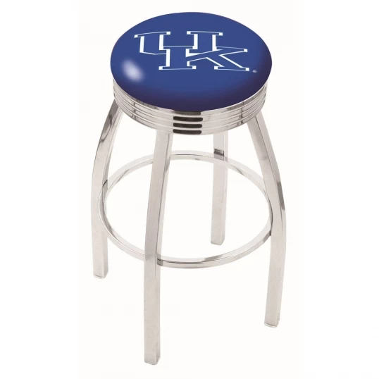 Made for the ultimate sports fan, impress your buddies with this knockout from Holland Bar Stool. This contemporary 30 inch Chrome Kentucky UK Swivel Counter Stool with Ribbed Accent has a single-ring chrome base with a 2.5 inch cushion and a 3 inch chrome ribbed accent ring that helps the seat to pop-out at first glance. Holland Bar Stool uses a detailed screen print process that applies specially formulated epoxy-vinyl ink in numerous stages to produce a sharp, crisp, clear image of your teams emblem. You can not find a higher quality logo stool on the market. The plating grade steel used to build the frame is commercial quality, so it will withstand the abuse of the rowdiest of friends for years to come. The structure is triple chromed to ensure a rich, sleek, long lasting finish. Construction of this framework is built tough, utilizing solid mig welds. If you are going to finish your bar or game room, do it right with a Holland Bar Stool.