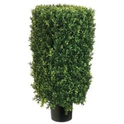 An artificial hedge is a perfect solution as a room divider. A topiary hedge can also be used in a window display or to hide a fence on an outdoor patio. Our boxwood hedge is durable enough to go outdoors but it does not have a UV inhibitor and will fade over time. This topiary is potted in a plastic pot that can be added to the decorative container of your choice.