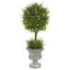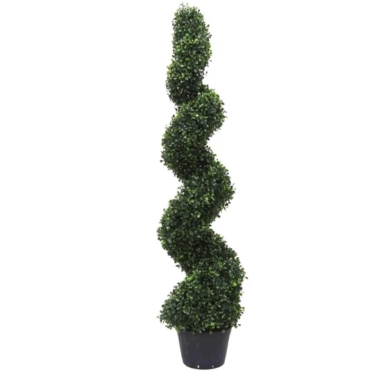 Artificial outdoor topiary will add a creative accent to the front entrance of your home or business. 4.2 foot artificial outdoor Boxwood spiral topiary can be installed directly into the ground for a natural look or in a decorative planter. Our outdoor Boxwood spiral topiaries are infused with a UV inhibitor that is designed to protect against harmful UV rays. These topiaries are designed to withstand average wind, rain and sunlight exposure.