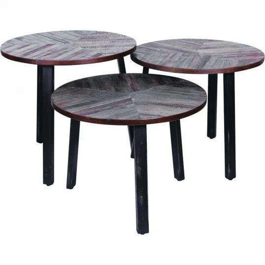 Traditional farmhouse style gets an industrial update in this stylized set of three decorative accent tables. Strips of solid teak wood converge at the center of the round tabletops while a weathered finish gives each surface a timeworn texture. Metal tripod legs feature a matte black finish, adding a touch of contemporary design to each table�s comfortable, countryside aesthetic.